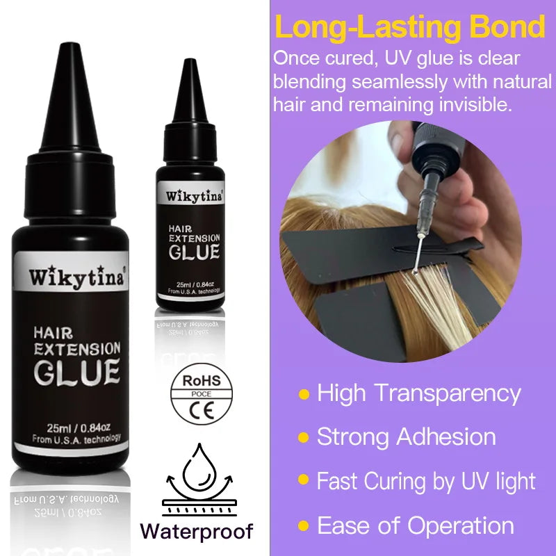 Once cured, UV glue is clear , blending seamlessly with natural hair and remaining invisible.
