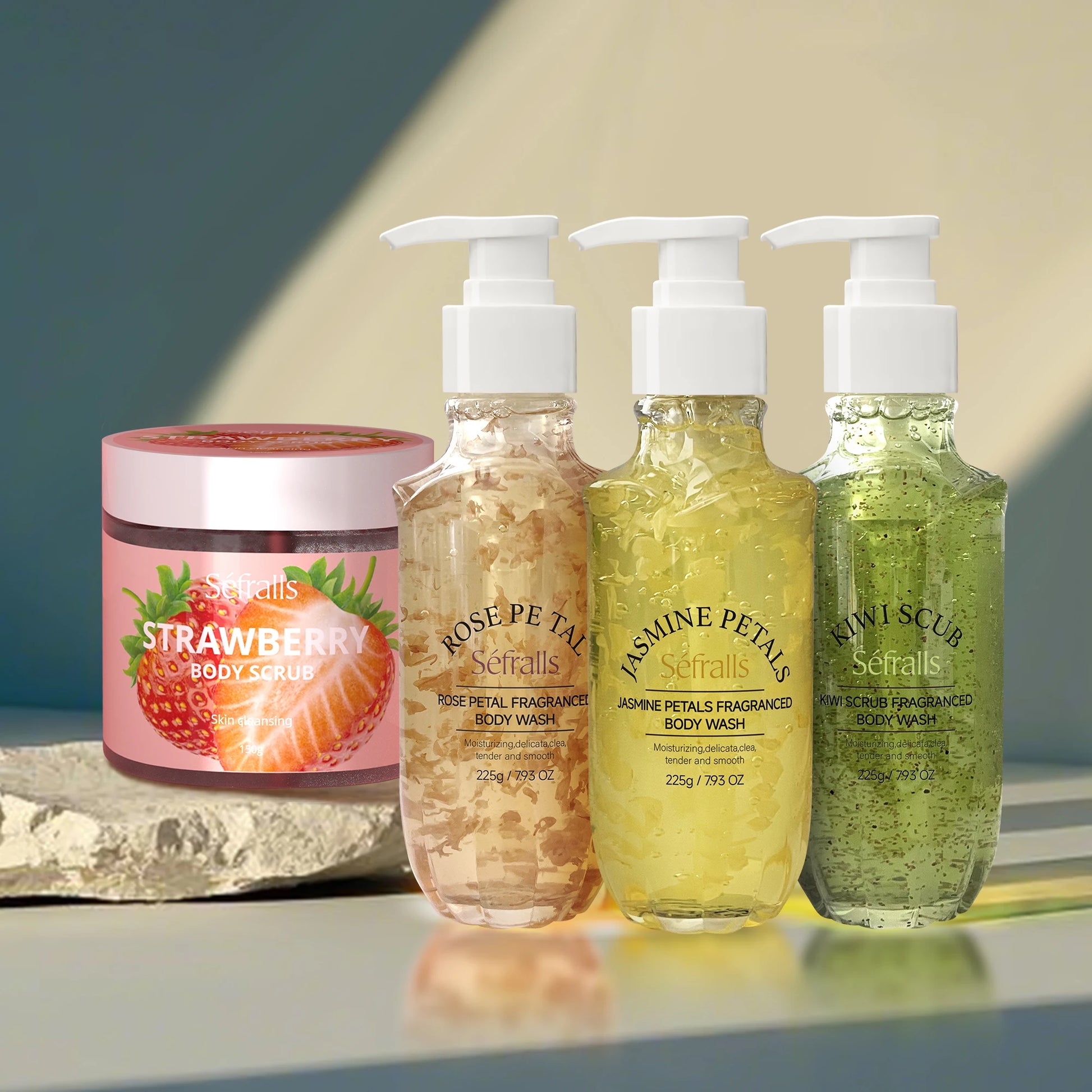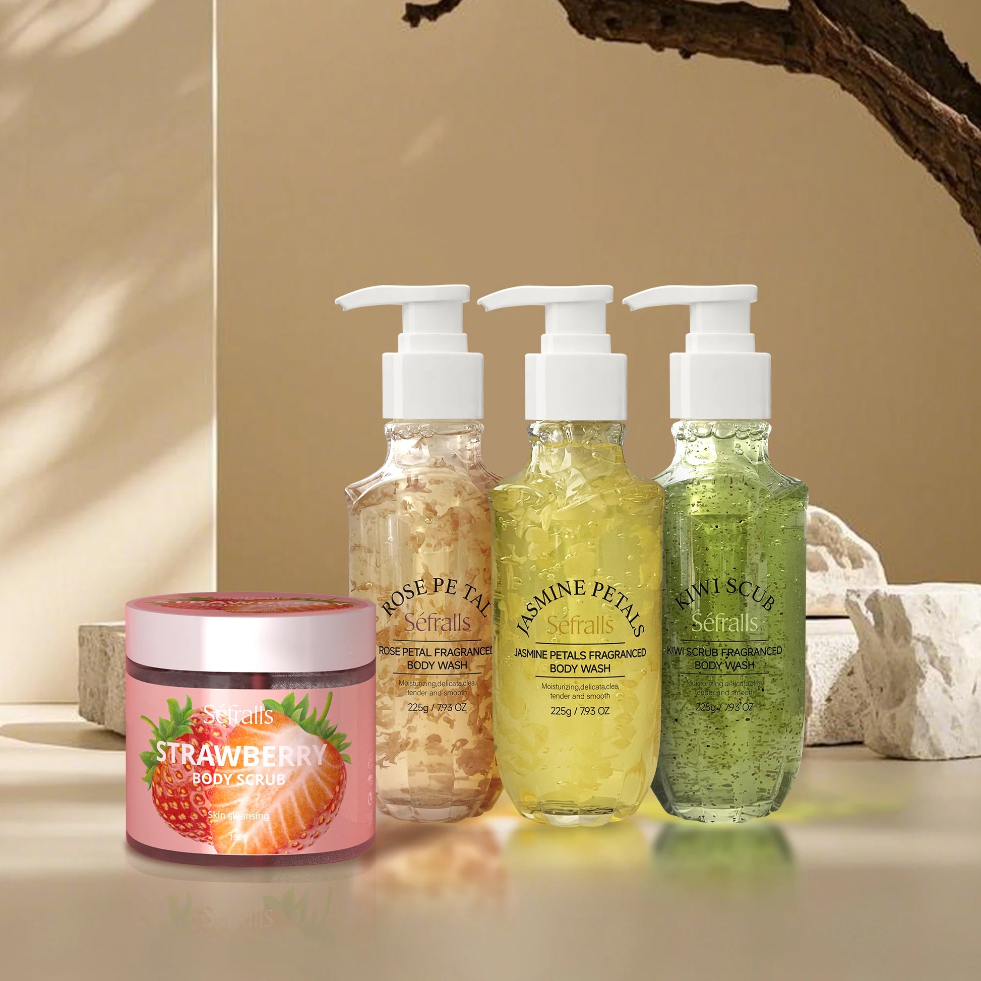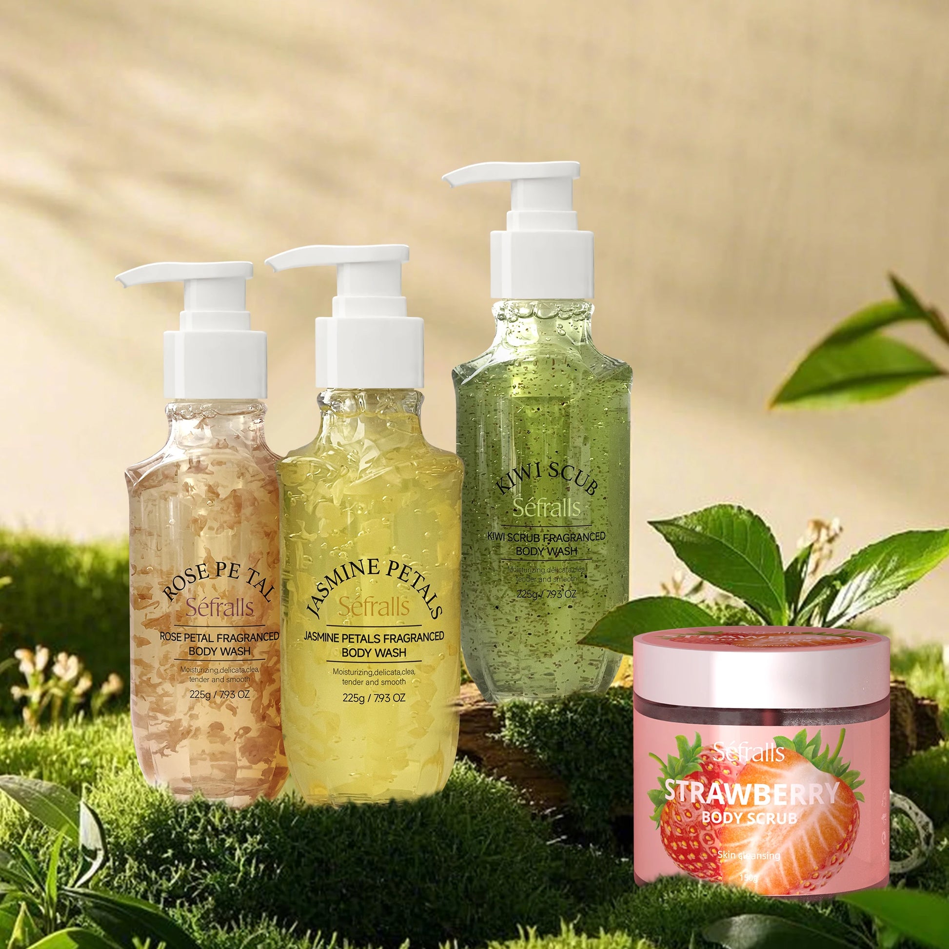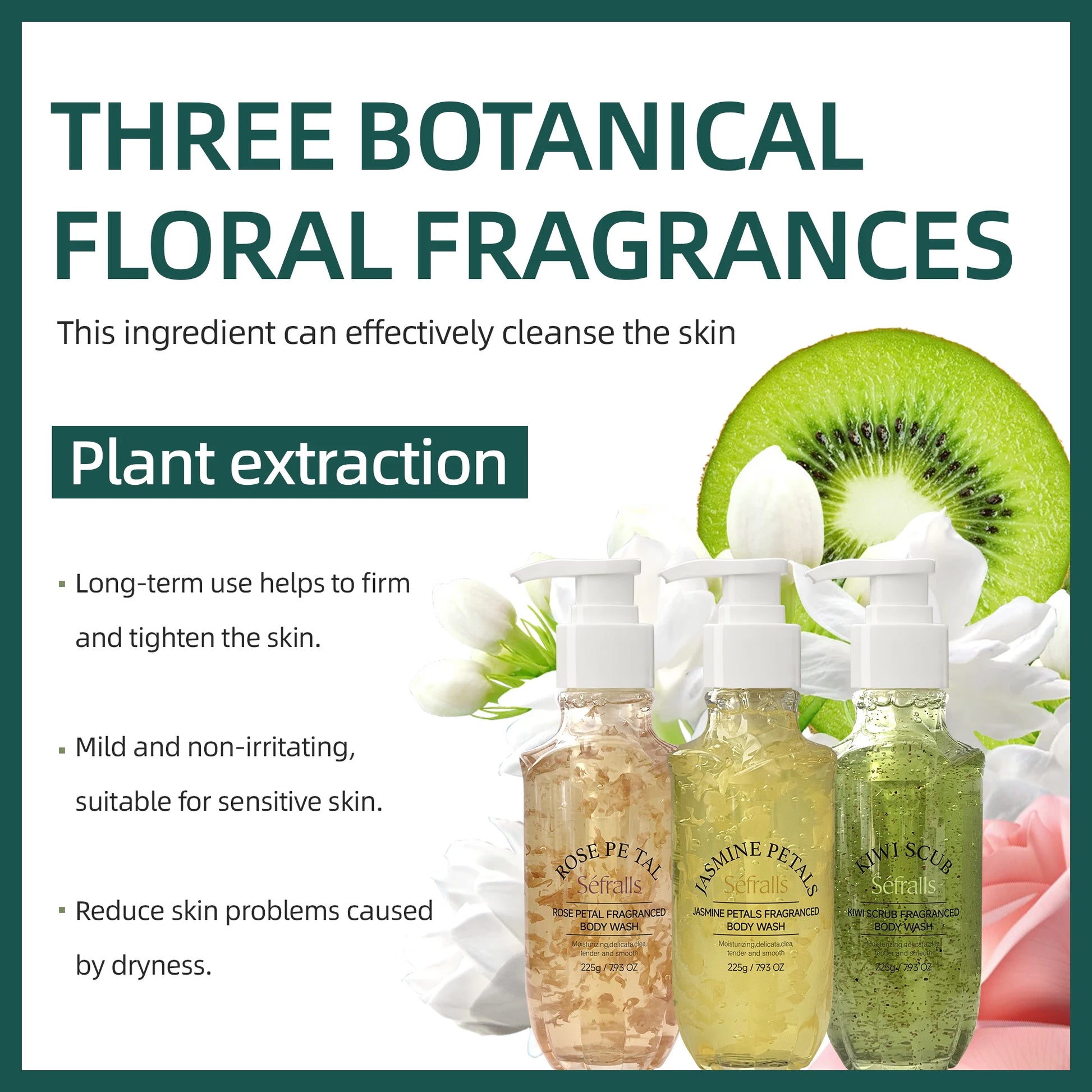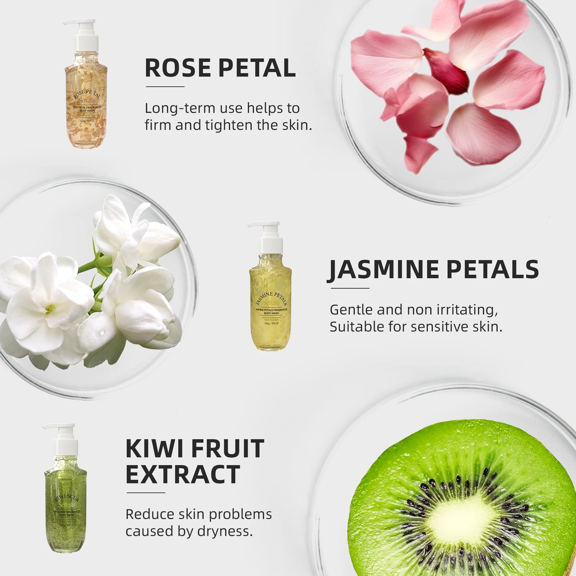 Séfralls Shower Gel offers three captivating scents: Rose, Jasmine, and Kiwi.