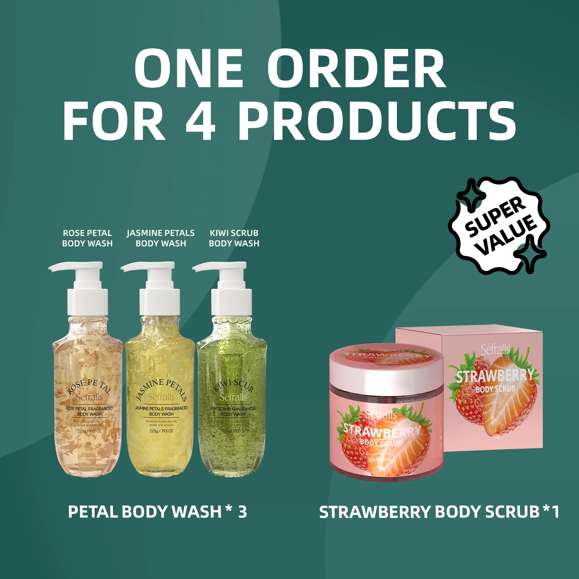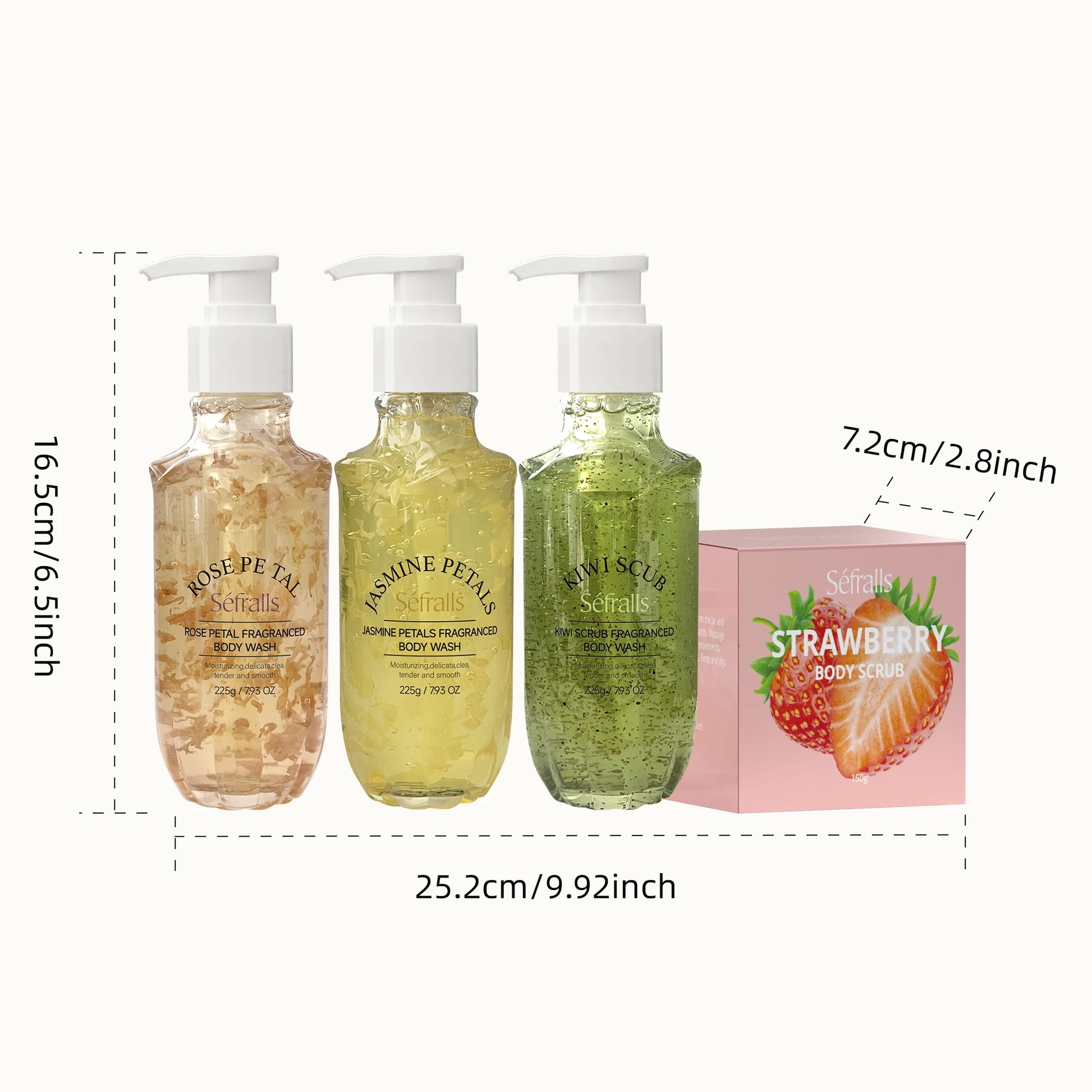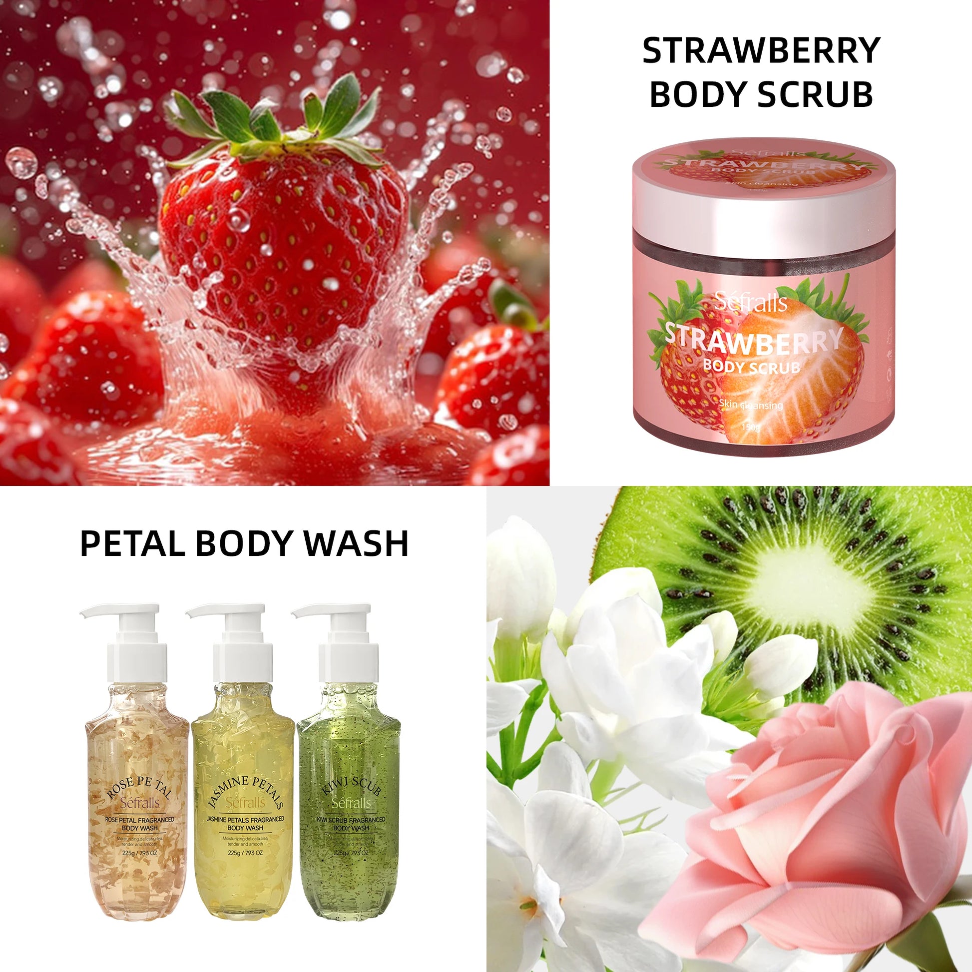 Rose Jasmine Kiwi Shower Gel 3pcs + Strawberry Body Scrub 150g