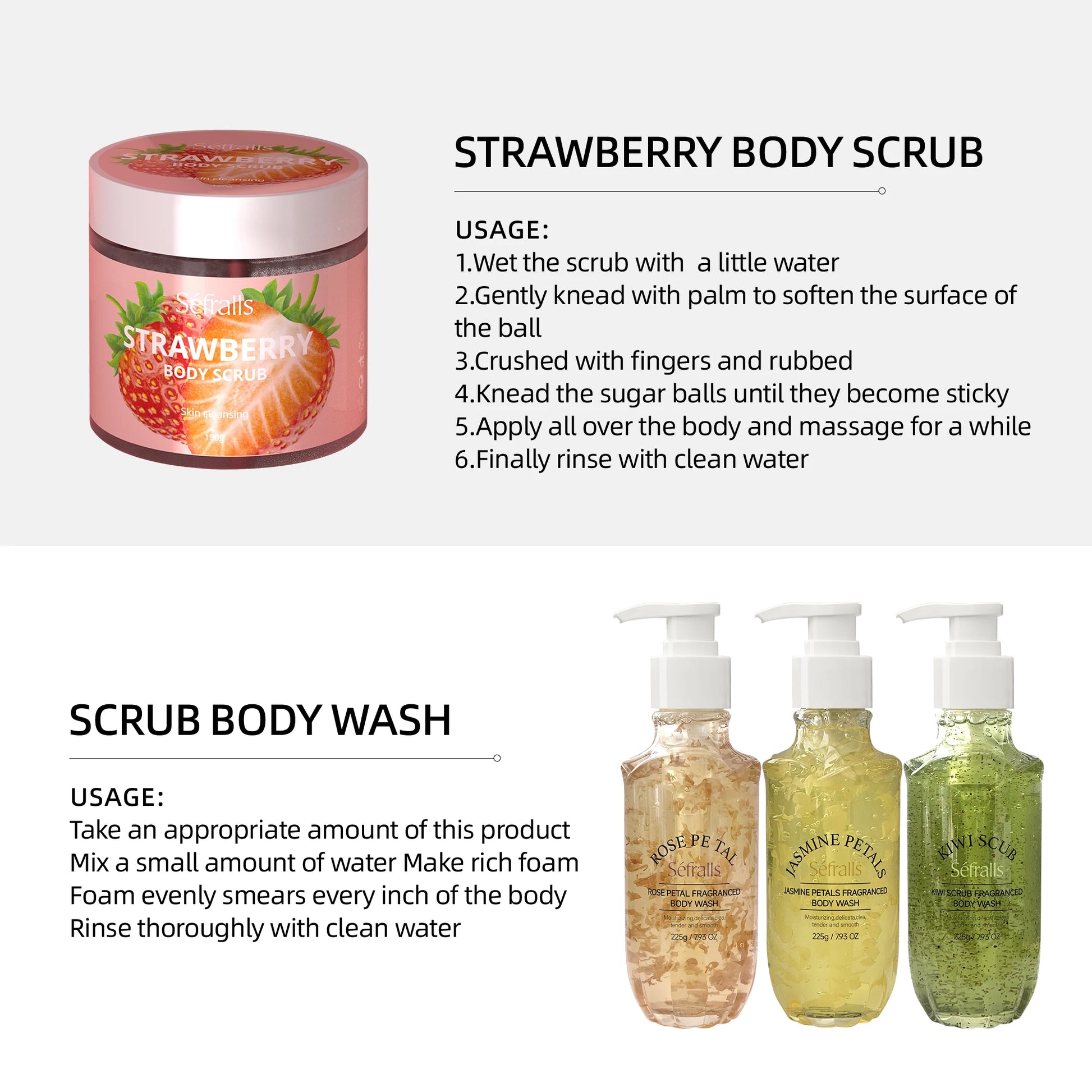 Strawberry Body Scrub: Infused with strawberry nutrients and moisturizing oils, it hydrates deeply while forming a protective moisture-locking barrier on the skin’s surface. This keeps your skin continuously hydrated, radiant, and supple.